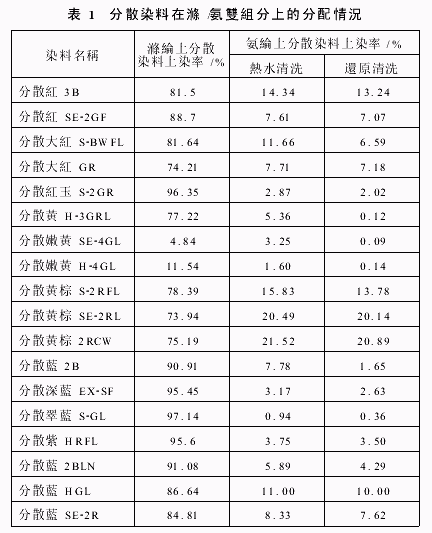 中溫型分散染料分散藍(lán)SE-2R則一直呈上升趨勢。但是,染色溫度超過90℃之后,其在滌綸組分中的上染率提升比在氨綸組分中快。從圖3可以發(fā)現(xiàn),分散染料在氨綸與滌綸兩組分上的分配,也隨溫度變化而呈現(xiàn)一定的規(guī)律。低溫階段,分散染料在氨綸上的上染率高于在滌綸上的上染率,三種染料的氨綸上染率之比分別于70℃、90℃和80℃后開始回落。當(dāng)溫度達(dá)到130℃時(shí),三種染料在兩種織物的上染分配系數(shù)為0﹒056、0﹒10、0﹒083,均高于氨綸與滌綸雙組分纖維的重量比(5︰95),即一般染色情況下,分散染料對氨綸組分的上染要高于滌綸組分。2﹒2 分散染料品種與滌/氨上染分配的關(guān)系采用18種常用分散染料,對滌/氨(95︰5)兩種纖維進(jìn)行染色。室溫開始染色,以3℃/min升溫至6120℃,保溫30min。染后分別用熱水清洗或還原清洗,測定各分散染料在兩組分中的上染率(見表1)。