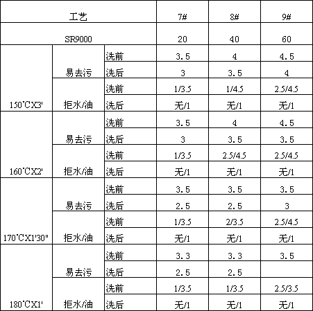 表2:去污整理耐久性效果(濃度:g/L,拒水拒油易去污:級)