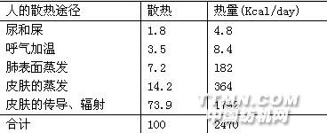 由上表可知,人在活動時,其功率為300瓦時,一天的水份蒸發孟為11500g/24hrs,若人的衣料以3M2計,則約需要40007g/M2,24hrs的透濕量。 人體發散的熱量,有輻射、傳導、對流和蒸發四個途徑,其熱量分配如表4所示,由此服裝散發熱是一小部分而已。有文獻報導;人在靜止伏態,每個成年人每天無感出汗量為700一1200g;在32一35℃的室外搬運貨物時,則每小時會排出1200一2000g的汗水,這是有感出汗。表4