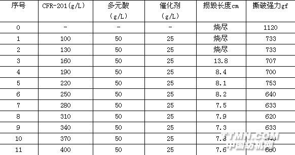 2 實(shí)驗(yàn)2·1 實(shí)驗(yàn)材料 21/2l 60×5O純棉平布 (青島裝飾布總廠),CFR-201阻燃劑 (上海農(nóng)藥廠)、HMM(工業(yè)品)、多元酸 (自制)、催化劑 (CP)等。2·2 儀器及設(shè)備 小軋車、烘箱、撕破強(qiáng)力測(cè)試儀、垂直法織物燃燒性能測(cè)定儀、分光光度計(jì)等。2·3 整理工藝 工藝流程: 浸軋(二浸二軋,軋余率100%)→烘干(100℃,3min)→焙烘(180℃,2min)→水洗(冷水沖洗)2·3·1 阻燃劑用量的影響 多元酸和催化劑不變,阻燃劑用量試驗(yàn)見表1。表1 不同阻燃劑用量的試驗(yàn)結(jié)果