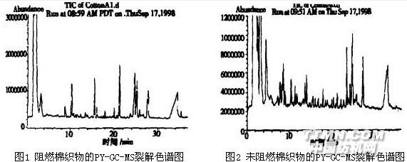 用PY-GC-MS聯用儀研究阻燃及未阻燃織物的裂解產物,在棉纖維的裂解一氣相色譜圖上確認了43個峰,認定了裂解產物40種,比國內外文獻多了12種;阻燃棉纖維的裂解產物確認了28個峰,含裂解產物27種。比國內文獻增加了4種。