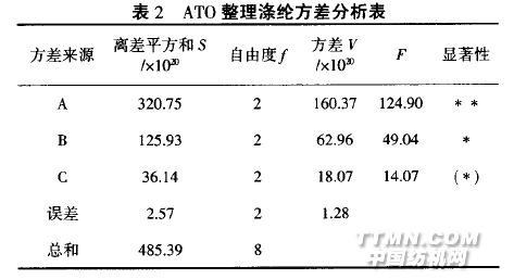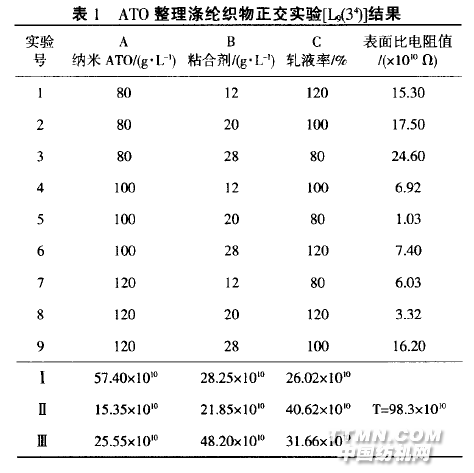 由表1及表2可知,納米ATO粉體質量濃度對整理織物表面比電阻值的影響特別顯著,粘合劑質量濃度影響顯著,軋液率影響較顯著,其優化方案是A2B2C1,即納米ATO 100g/L,粘合劑20g/L,軋液率120%。考慮到實際操作中滌綸織物軋液率不易達到120%,故軋液率取100%,則優化方案是A2B2C2。對最優工藝進行驗證,測得整理織物的表面比電阻值為9.28x109Ω,小于正交實驗最小的表面比電阻值1.03x1010Ω。
