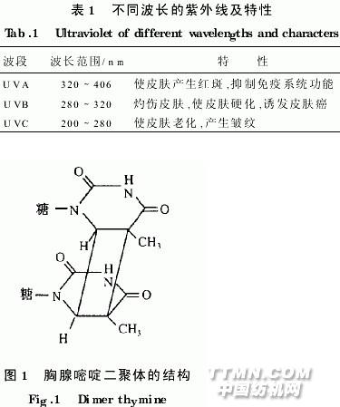 2 納米材料在紡織品多功能整理上的應(yīng)用2.1 抗紫外線、抗可見(jiàn)光功能的紡織品太陽(yáng)光中能穿透大氣層到達(dá)地面的紫外線占太陽(yáng)光總能量的6%左右。其波長(zhǎng)范圍從200~406nm,大致可分為三個(gè)波段,見(jiàn)表1[2]。UVC在穿過(guò)大氣層時(shí),大部分被臭氧層吸收,危害人體健康的主要是UVA和UVB。紫外線照射能使細(xì)胞DNA鏈中相鄰的嘧啶形成二聚體,主要是胸腺嘧啶二聚體[3]。