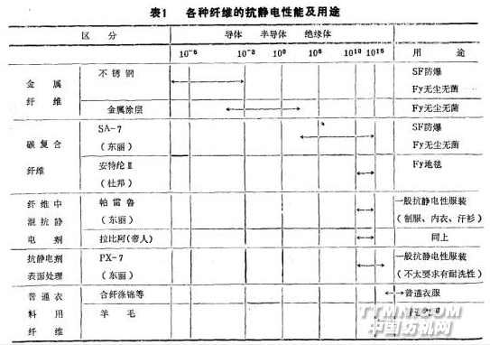 有人按纖維的表面比電阻的大小排列了一張用途表[1]。(見表1),顯然制表人認為,纖維的表面比電阻<1010Ω·厘米,就可符合日常穿著服裝的防靜電要求。