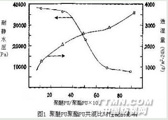 如將二者按一定比例進(jìn)行共混改性,得“PU高分子合金”,分別制成底涂膠和面涂膠,則可以綜合二者的優(yōu)點(diǎn),涂層得到既有優(yōu)良防水性能,又具有優(yōu)良透濕性的可呼吸涂層織物。