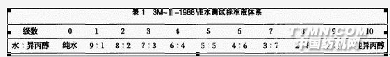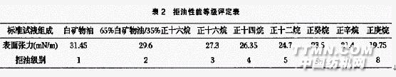 (2)拒油效果測試圈.按AATCC一118—1987標準,應用8種表面張力依次降低的烴類液體同系物(見表2)滴在織物表面,靜置30s后,觀察試液狀況,以在30s內不潤濕織物的試液的最大等級作為拒油度.