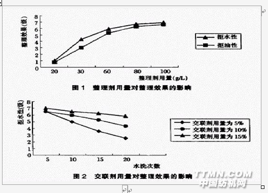 0 前言 織物的拒水拒油整理就是在織物上施加一種或數種整理劑,改變其表面性能,使其不易被水和常見油污所潤濕或沾污前期將有機氟樹脂運用于錦綸、滌綸、滌,棉等織物的拒水拒油整理方面的報道較多,但對陽離子可染滌綸的耐久性整理研究較少.陽離子可染滌綸是國內外倍受重視的改性滌綸產品,它除了具有普通滌綸的優良性能外,由于第三單體的加入,染色性能還得到較好的改善.若再經過拒水拒油的耐久性整理,必將大大提高陽離子可染滌綸的工業附加.本文采用防水劑FS一506對陽離子可染滌綸進行拒水拒油整理,探討了整理的優化條件,并研究了拒水拒油整理對織物服用性能方面的影響. 1 試驗材料和方法 1.1 材料 陽離子可染滌綸斜紋織物.規格:8.96texx9.89tex.經緯密:496x346/10cm.防水劑FS一506(~丹東恒星精細化工有限公司提供).化學組成:全氟聚合物.外觀:白色至微黃不透明分散液.PH值:2.2.5.離子性:陽離子. 1.2 拒水拒油整理的工藝 整理工藝流程:二浸二軋——預烘(80℃,5分鐘)——焙烘(180℃,6Os) 整理劑:防水劑FS一5O6.交聯劑:ECO.催化劑:MgC1軋余率:65%-70% 1.3 性能測試 (1)拒水效果測試田.按3M—II一1988方法進行.用異丙醇與水以不同比例混合,建成標準測試液體系,如表1所示.檢測時,從低級數試劑開始,取測試液滴在待測樣布布面上,若10s內未潤濕則為通過,至不通過為止,取最后通過的級別.