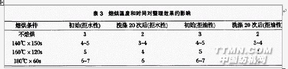 ,但卻可大幅提高整理織物的拒水拒油的耐久性. 因為含多羥基的交聯劑(如ECO),除了能通過化學鍵與含羥基的有機氟聚丙烯酸酯乳液交練外,還能與滌綸分子之間形成交聯狀含氟樹脂聚合膜,它牢固地固著在織物上,從而提高拒水拒油耐洗性.加入交聯劑,則需同時加入催化劑,才能使交聯劑充分發揮加固薄膜的作用. 2.3 焙烘溫度和時間對整理效果的影響 當在防水劑FS-506用量為80g/L、交聯劑用量10%的情況下,焙烘溫度和時間對整理效果的影響見表3.試驗結果表明:當焙烘溫度達180~C時,拒水拒油性能最好,而且耐洗性好.