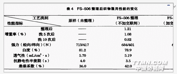 水洗10分鐘,然后再清水洗2分鐘,即完成一次水洗.分別洗滌不同次數后再測其耐洗效果. (4)服用性能測試:①強力:在YG065型強力拉伸儀上測試強力.②白度:在WSP-II型白度儀上測定,每個試樣測正反各兩次取平均值.③透氣性:在AP-360型織物透氣儀上測定,測五次取平均值.④抗靜電性:在StaticHonestMeterType-5109型靜電測試儀上測定半衰期(s),測三次取平均值.⑤懸垂性:在YGS11型懸垂儀上測定懸垂系數(%),測兩次取平均值. 2 結果和討論 2.1 拒水劑用量對整理效果的影響 在交聯劑ECO用量為l0%(相對于防水劑FS一506)、焙烘溫度170~C、焙烘時間60s等固定的條件下,防水劑FS-506用量對整理效果的影響見圖1.