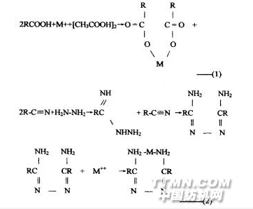 采用濃鹼水解方法,使纖維上氰基變?yōu)轸然c鹽,再用鹽酸酸化為羧基。而后用金屬鹽與之反應(yīng),生成金屬絡(luò)合物(1),可以獲得很高的限氧指數(shù)。但是濃鹼水解的不光是氰基,它也拆斷纖維的長(zhǎng)鏈,因此纖維強(qiáng)力下降比較嚴(yán)重,如果用水合肼來(lái)處理腈綸,氰基與聯(lián)氨加成,生成二胺,進(jìn)而與重金屬螯合(2),獲得阻燃效果,而對(duì)纖維的損傷程度,比鹼水解方法小得多。