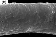 處理前后織物的表面形貌用掃描電鏡 (JSM-5600LV, Jeol日本)測定。