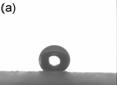 圖3的實驗結(jié)果表明,當(dāng)液滴的pH從1.07到13.60之間變化時,所有接觸角的值在146.2° 到 152.3°之間(圖4為具有不同pH值的液滴在超疏水表面上的照片),接觸角沒有出現(xiàn)顯著的變化。該結(jié)果說明液滴的酸堿性對接觸角影響并不明顯。這可能是由于表面被ODTES層覆蓋,ODTES層具有化學(xué)抵抗的內(nèi)在特性。這