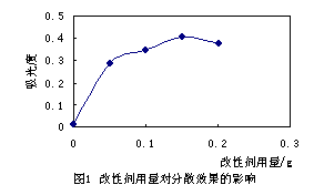 從圖1可見,隨著無機改性劑用量的增加,分散液的吸光度增加,但到一定濃度后,增加緩慢,甚至有下降的趨勢。這是由于無機改性劑的Na+離子在Zn0表面吸附并形成雙電層,使粒子之間發(fā)生團聚的引力大大降低,可達到快速分散的目的。隨著無機改性劑濃度的增加,因為形成雙電層的厚度反比于濃度的平方根,所以濃度太