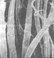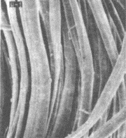 | 圖1.未經酶處理的苧麻纖維縱向表面情況 | 圖2.經酶處理的苧麻纖維縱向表面情況 |