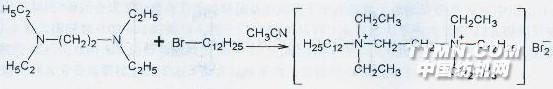 R為疏水鏈;I為陽離子親水基團;Y為聯接基圖1 陽離子型雙子表面活性劑結構示意圖1含碳氫鏈聯接基的陽離子型雙子表面活性劑 含碳氫鏈聯接基的陽離子型雙子表面活性劑與其他表面活性劑相比更易吸附在兩相界面,其吸附能力是其他表面活性劑的10~1000倍,因而在降低表面張力、發泡、穩泡、乳化方面具有高效性,同時此類活性劑具有較低的臨界膠束濃度(cmc),其cm,c僅為其他表面活性劑的1/10~1/100.另外表面活性劑雙倍的正電荷基頭和其他單季銨鹽陽離子表面活性劑復配時具有更為強烈的協同增效作用,一般添加1/10即可成倍地增加效果. 盧婷等用BrC12H25和乙腈等合成了一種具有短聯接基團的陽離子型雙子表面活性劑二亞甲基-1,2-二(十二烷基二乙基溴化銨),簡寫作C12C2C12(Et).將16.42 g BrC12H25置于圓底燒瓶中,再加入25 mL乙腈,加熱至沸,混溶5.15 g N,N,N',N '-四乙基-1,2乙二胺與12 mL乙腈的混合物滴人燒瓶中,加熱回流并補加乙腈,使溶劑量基本保持不變.回流48 h后旋干溶劑得到棕色固體.用乙醇一乙酸乙酯重結晶6次即得較純的產物,化學方程式為