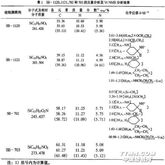 SB-702與D4或DMC或線性體在堿性催化劑作用下制得氨基硅油,然后使用復合的AEO系列乳化劑乳化成各種規格的微乳液。SB-702分子中只有一個仲氨基在織物后整理的焙烘中不易被氧化黃變,但柔軟性比602稍差些。目前,使用它生產不黃變的有機硅柔軟劑。以環己氨基系列的硅烷偶聯劑如表1[20]。表1 SB-1120,SB-1121,702和703的元素分析及H-NMR分析結果。