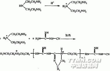 1.2 制備方法 第一步:將二乙烯三胺加入到反應容器中,邊攪拌邊緩慢加熱,同時加入等摩爾氯化銨,于90℃反應1h,將反應溫度升至100℃,迅速加入等摩爾雙氰胺,繼續升溫至150℃左右,反應1.5h。反應過程中會放出大量氮氣,需用接收裝置收集,反應物的粘度隨反應的進行不斷增加,反應結束后,將反應物快速加入一定量的水中,攪拌后