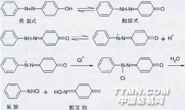1、染料的氯漂褪色機理 泳衣的耐氯牢度一般要求很高,近年很多人在這方面做了較多研究,主要從氯漂褪色機理著手,氯漂褪色主要因偶氮基互變異構體的離解反應而引起,偶氮基鄰位或對位有羥基的偶氮染料會發生質子轉移而產生偶氮一醌腙互變異構現象。反應歷程如下