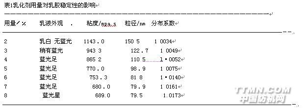 從圖1可以看出,隨著乳化劑用量的增加,單體轉化率逐漸增加。乳化劑用量從2%增加至5%時,凝膠率下降較快,之后呈逐漸降低趨勢。這是因為,在乳化劑用量較小時,乳化劑分子難以完整覆蓋乳膠粒表面,乳膠粒子易發生聚結,由小乳膠粒生成大乳膠粒,造成凝膠。增大乳化劑用量,可以提高乳化劑在乳膠粒表面覆蓋的完整性,從而提高乳液聚合的穩定性,減少乳液聚合過程的凝膠率;大量乳化劑使用雖然可以提高乳液聚合的穩定性,但在乳液成膜時,乳化劑殘留在膠膜上,影響膠膜性能。因此,乳化劑的用量也不可過高。實驗結果表明乳化劑用量為6%,凝膠率已是小于0•l%,乳液聚合已相當穩定,同時聚合具有較高的單徠轉化率。2.3可聚合復合乳化劑用量對乳膠性能的影響單位體積乳液中的乳膠粒數目及乳膠粒直徑是決定乳膠性質的兩個重要參數,這兩個參數都隨著乳化劑的濃度而發生變化。為此,本文研究了乳化劑用量對乳膠性能的影響,結果見表1。表1乳化劑用量對乳膠穩定性的影響