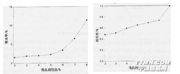 圖2乳化劑用量對乳膠膜吸水率的影響 圖3乳化劑用量對乳膠膜溶失率的影響從圖2、3可以看出,隨著乳化劑用量的增加,乳膠膜的吸水率和溶失率逐漸增大。這是因為膠乳成膜過程中,乳化劑難以揮發,小分子乳化劑分散在膠膜內,使膠膜的結構疏松多孔,不致密,而這些乳化劑又帶有大量的親水基團,易溶解、析出,導致膠膜的耐水性下降。 由于帶有親水基團的小分子乳化劑在水中易溶解析出,因此,量化研究乳膠膜溶失率與乳化劑用量之間的關系具有重要意義。為此,考察了乳膠膜溶失率與乳化劑用量比值的變化趨勢。