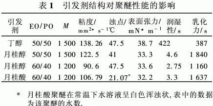 濁點:不同引發(fā)劑的聚醚濁點大小有以下順 序:丁醇>月桂醇聚醚,月桂醇>月桂酸聚醚。當 引發(fā)劑的鏈長增加時,分子中的疏水基比例增大, 分子同水之間的氫鍵結合力變弱,因而在相對分 子質量相同的聚醚中,長碳鏈聚醚的濁點低于短 碳鏈聚醚;而酯醚由于分子中的酯鍵形成氫鍵的 能力比醇醚分子中的醚鍵小,因而與水的親和性 較差,當溫度升高時較易發(fā)生脫水析出;同時,由 于以酸為引發(fā)劑的聚醚在合成過程中會形成少量 的雙酯,即: R-C=O-O(EO)n(PO)m-O- O=C-R,造成聚醚的水溶性下降,因此這類聚 醚的濁點較低。而月桂酸聚醚又具有較長的烷基 鏈,因而濁點更低,在常溫下已不能很好的溶于水 中,呈白色渾濁狀。