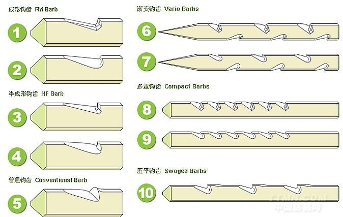 普通鉤齒其邊緣鋒利粗糙,在針刺時易割斷纖維而降低織物拉力,為了減少鉤齒本身對纖維造成的損傷,可制成成形鉤齒和半成形鉤齒,成形鉤齒是用精密模具將鉤齒鋒利的邊緣加以修整,形成許多弧面組成的圓滑鉤齒(如上圖①,②)。