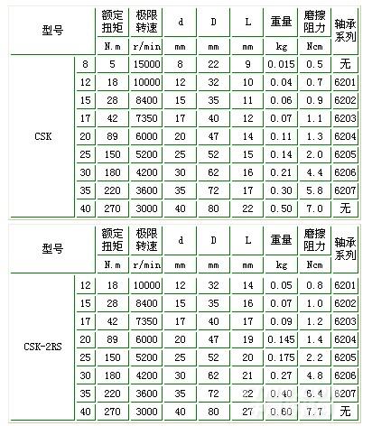 CSK型是深溝球軸承和楔塊式離合器相結合的組合式單向離合器,俗稱單向軸承、單向旋轉球軸承或防倒轉軸承。外型尺寸與62系列軸承相同(8號40號除外),內含滾珠支撐及潤滑脂,兩邊防塵蓋可以防止0.3mm以上的灰塵鐵屑進入內部,也可根據使用需要自行更換簧片式密封蓋。CSK-2RS型為加寬型(兩側密封)。