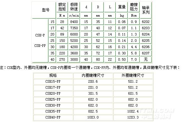 CSK-PP內外環均有鍵槽,建議公差為內環與工件軸心為k6公差,外環與工作壁為K6公差,若要采用滑配方式安裝,內環與工作軸h6之公差或外環與機壁H6之公差亦可。鍵槽標準為DIN6885.3, 40號的為DIN6885.1。