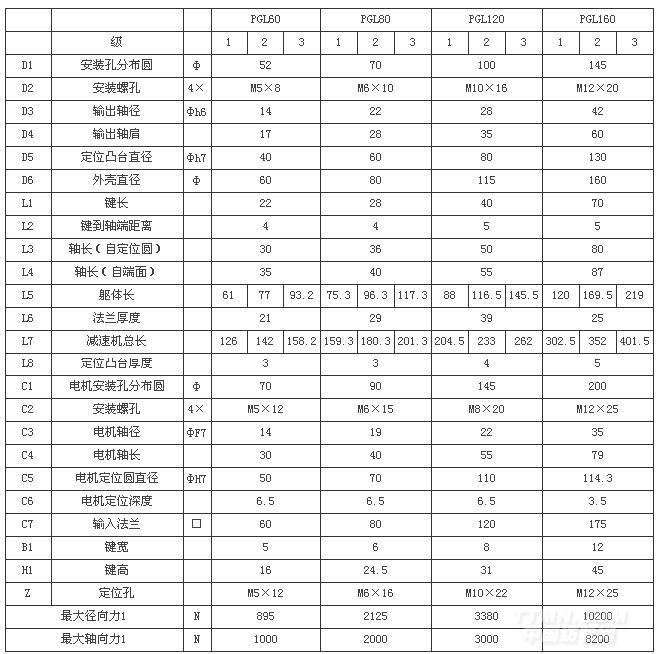 角標“1”在輸出轉速100rpm時,使用壽命20000h,作用于輸出軸中心位置(L/2處)之容許徑向及軸向力