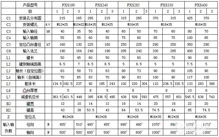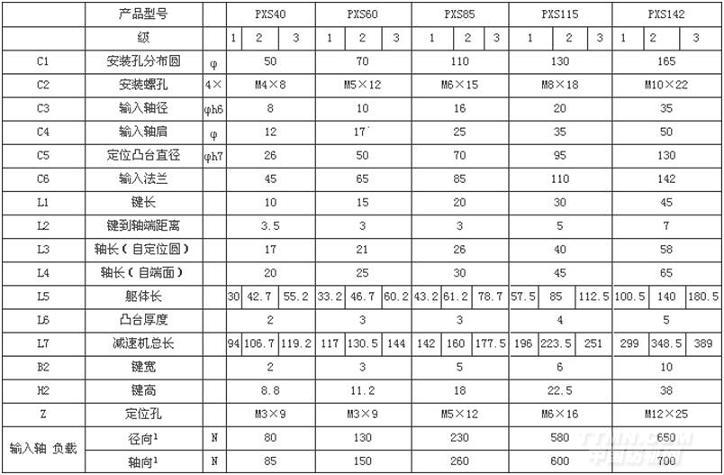 角標“”在輸入轉(zhuǎn)速3000rpm時,使用壽命作用于輸入軸中心位置(L/2處)之容許徑向力及軸向力備注:PXS系列除轉(zhuǎn)動慣量與系列不同外,其余參數(shù)均可參考對應(yīng)的系列