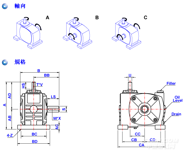 以CHENTA品牌行銷全球 NEMA 及 IEC 標(biāo)準(zhǔn) 速比范圍 5:1 到 3,600:1 馬力范圍 1/4 HP 到 300 HP 高品質(zhì)雙唇油封 蝸桿采用 S45C 中碳鋼經(jīng)硬化熱處理后, 牙面齒型研磨 300型(含)以上,蝸桿采用 SCM440 鉻鉬合金鋼,經(jīng)調(diào)質(zhì)高周波處理,牙面齒形研磨。蝸輪材質(zhì)采用高品質(zhì)之ALBC3 鋁青銅 , 具有最佳耐磨性 機體外殼采高強度之 FC-20 灰口鑄鐵 300 型(含以上) , 機體外殼采更高強度之 FCD45 球狀石墨鑄鐵 入力軸承使用圓錐滾子軸承萬用型具
