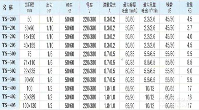 TS201-405鼓風(fēng)機(jī)特性說明: 一般用于塑膠材料片材的擠出、吹塑等相關(guān)機(jī)械設(shè)備上的抽排風(fēng),采用鋁合金重力壓鑄外殼,配合離心葉輪及優(yōu)化參數(shù)設(shè)計(jì),使各風(fēng)壓及風(fēng)流量達(dá)到所配置的性能最優(yōu),以利使用壽命能完全配合所設(shè)計(jì)的8---10年! TS系列說明:名稱 出口徑 出力 頻率 電壓 滿載電流 最大靜壓 最大風(fēng)量 噪音 重量
