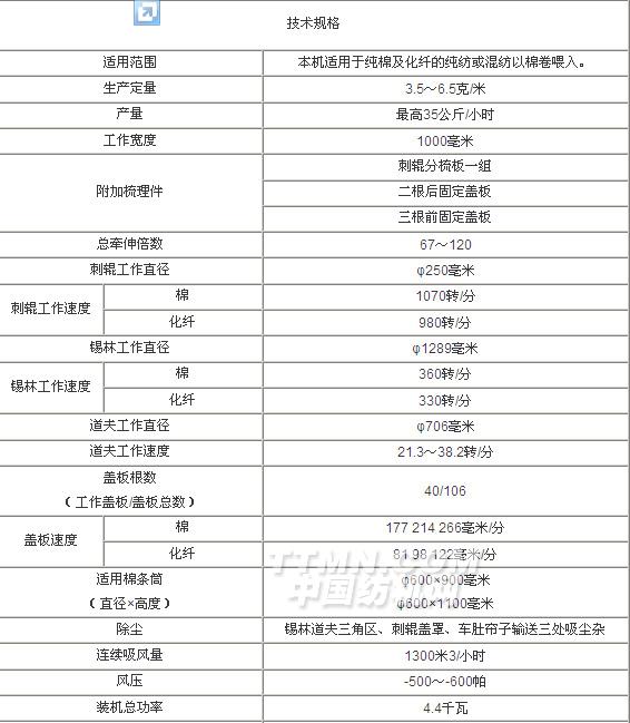 主要特點: ●獨有專利的三羅拉剝棉; ●增加刺輥分梳板; ●增設前三后二固定蓋板; ●道夫快速剎車; ●采用階梯式壓輥; ●道夫采用同步帶傳動; ●左右封閉式安全罩; ●優質的金屬針布。