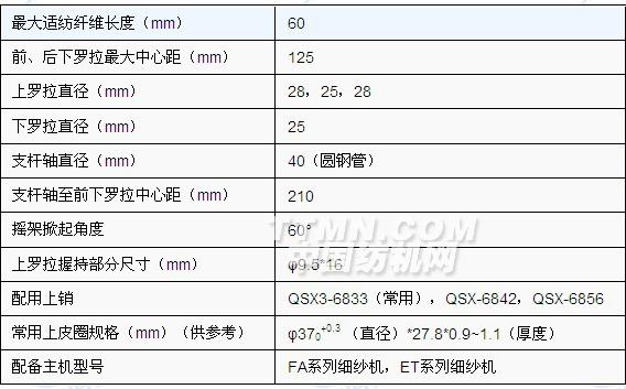5、 前、中加壓桿組為一體套裝在后分配桿內(nèi),可嚴(yán)格保證搖架主牽伸區(qū)羅拉的平行度。