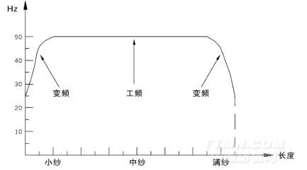 在小紗與大紗時(shí),主電機(jī)由變頻驅(qū)動(dòng),中紗時(shí)由工頻驅(qū)動(dòng)。可有效降低功耗,延長(zhǎng)變頻器使用壽命。