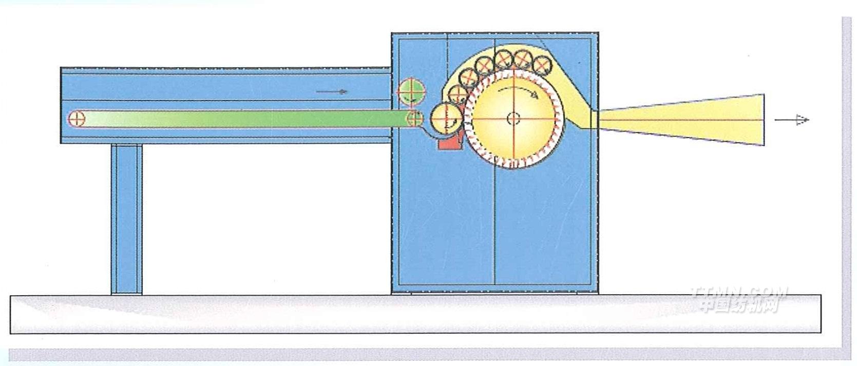 纖維凝聚器確保纖維從一個開松單元輸送到下一個開松單元。纖維凝聚器設計獨特、電動橫向運動、蓋子自動提升后兩側防護裝置打開,以上使得纖維凝聚器和兩組松單元易于清潔和維修。第一個開松單元配置有未開松碎片回收裝置(回喂到系統(tǒng)中),設備運轉時驅動器調整折翼開合將未開松碎片回喂到系統(tǒng)中。