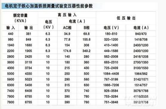 試驗電源變壓器為三相輸入單相輸出,通過有載調(diào)壓開關(guān)切換和低壓轉(zhuǎn)接,輸出電壓有324檔,調(diào)壓幅度之大,級數(shù)之細,基本上可滿足各種電機定子鐵心在不同磁密條件下做試驗,測試其鐵心損耗。有關(guān)變壓器額定容量可根據(jù)不同電機鐵心的激磁功率而定。本公司目前定型產(chǎn)品有下列多種規(guī)格可適應(yīng)180萬千瓦以下各種電機定子鐵心加熱做鐵損試驗,具體規(guī)格如下。