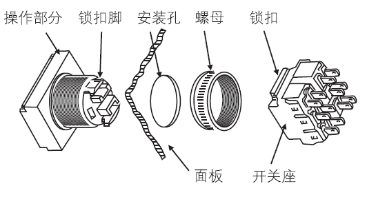 安裝順序為:將操作部分穿過面板孔,擰緊螺母后固定,然后將開關座的鎖扣與操作部分的鎖扣腳位置,壓入成一體,拆卸開關座時,將開關座鎖扣壓向內側就可拆卸.