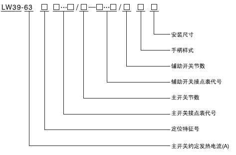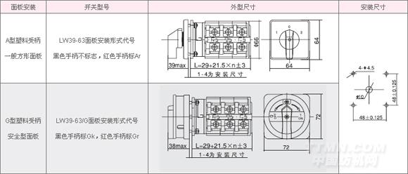 (2)“1-4mm”的安裝尺寸,可以按照客戶要求,定制任何按長尺寸的轉換開關。客戶要求的安裝尺寸可以標志在開關型號的手柄樣式后面。如采用G型安全型手柄、安裝尺寸為40mm的63A轉換開關,型號為:LW39-63□□…□/□GK40