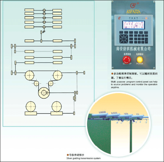 此機型具有速度高、結構新穎、質量穩定等特點。采用高架順向積極喂人,搖架彈性加壓,全新的三上三下上托式防積塵壓力棒雙區曲線牽伸形式不僅對浮游纖維的控制力增強,而且有利于解決因壓力棒積塵而造成的紗疵問題;廣泛采用同步帶、平皮帶,三角帶傳動,增加傳動柔韌性,降低噪聲,減少傳動級數,傳動輕快、平穩,有效消除傳統并條機的漏油和發熱等問題;主牽伸和后區牽伸相對獨立,牽伸倍數調節方便;采用真空吸塵及上下清潔裝置,吸風量大,并可調節,保證棉條通道的清潔,減少飛花積聚;上清潔采用浮動金屬棒,抗靜電、散熱性好,清潔效果好,全機清潔系統可靠,減少了紗疵;該機機電一體化程度高,電氣控制采用專用可編程器控制,采用觸摸式操作面板,并實時顯示機器的運行故障情況。