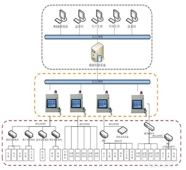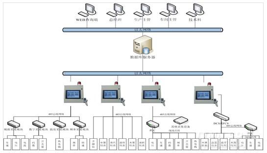 ①數(shù)據(jù)采集設(shè)備——對(duì)車間設(shè)備連接的參數(shù)傳感器進(jìn)行數(shù)據(jù)采集,為現(xiàn)場(chǎng)監(jiān)控終端提供數(shù)據(jù)來(lái)源。采集設(shè)備主要包括:車速碼數(shù)采集模組、溫度采集模組、縫頭采集模組、門幅采集模組、含潮率采集模組以及能源(水、電、汽)數(shù)字儀表等。