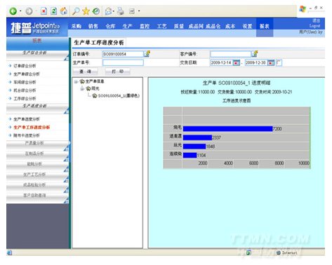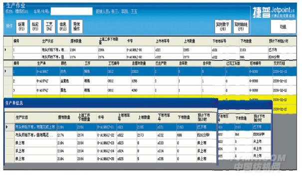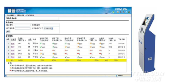 (2)客戶自助終端——在樣品陳列室或客戶接待室,設(shè)置客戶自助查詢終端;或者在企業(yè)網(wǎng)站上開設(shè)查詢頁(yè)面,客戶可以通過(guò)自助查詢終端或互聯(lián)網(wǎng)查詢自己訂單的實(shí)時(shí)生產(chǎn)進(jìn)度、查看成品的驗(yàn)布報(bào)告、查看歷史訂單等。