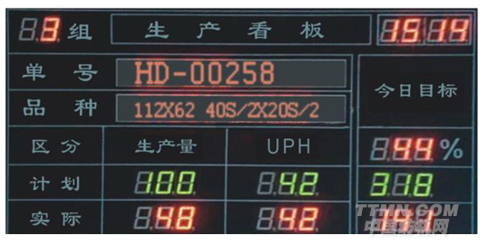 (1)車間LCD看板系統(tǒng)——滾動(dòng)顯示訂單生產(chǎn)進(jìn)度、當(dāng)前車間的生產(chǎn)任務(wù)、產(chǎn)量匯總信息、車間布帳流轉(zhuǎn)信息等。