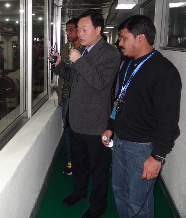 < 圖片 No. 6> 區(qū)域銷售經(jīng)理鄭穩(wěn)權(quán)先生帶領(lǐng)孟加拉客戶參觀立信染整的生產(chǎn)基地。