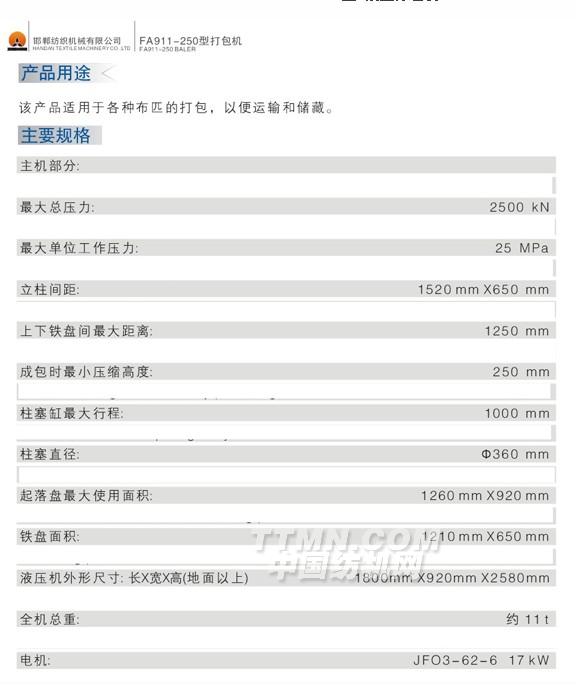 您所在的位置:紡機網 >> 邯鄲紡織機械有限公司(邯鄲宏大化纖機械有限公司) >> FA911-250型 液壓打包機