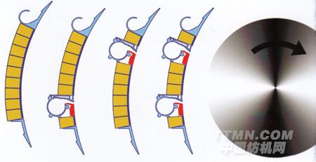 強(qiáng)大的離心力對于纖維尾端上揚(yáng)以及排雜的作用顯而易見,離心力越大,對于透徹梳理和排雜越有利。根據(jù)離心力公式(質(zhì)量×速度平方/半徑)可知,小直徑可帶來大的離心力,但同時(shí)梳理面積必然減小,錫林表面線速度(即分梳點(diǎn))也同時(shí)減小。