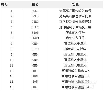 SC100B控制器提供兩個接口,P1口為14位接線柱,用于脈沖、方向、原點、3位輸入/2位輸出,所有信號經光電隔離,11、12腳輸出可驅動高達0.5A的負載。P2接口提供啟動、停止、4位輸入/輸出。對I/O口需求多的用途,用戶可用P2口,如需光隔的P2口信號則需另外購買與P2口相配的轉接板。