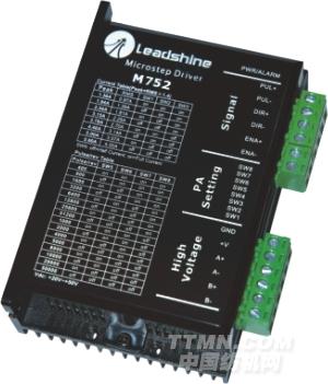 M752型驅動器,主要驅動57、86型兩相混合式步進電機進行高速和高加速度運行,高速性能特佳。其微步細分數有16種,最大步數為51200Pulse/rev;其工作峰值電流范圍為1.26A-5.2A,輸出電流共有8檔,電流的分辨率約為0.5A;具有自動半流,過壓、欠壓和過流保護等功能。本驅動器為直流供電,建議工作電壓范圍為36VDC-68VDC,電壓不超過75VDC,不低于20VDC。