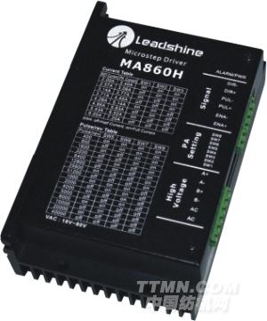 MA860H驅動器,主要驅動86、110型兩相混合式步進電機。其微步細分數有16種,最大步數為51200Pulse/rev;其工作峰值電流范圍為2.4A-7.2A,輸出電流共有8檔,電流的分辨率約為0.6A;具有自動半流,過壓、過流保護等功能。本驅動器為交直流供電,建議工作電壓范圍為48VAC-80VAC,電壓不超過90VAC,不低于24VAC。