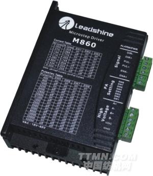M860 V5.0驅動器,主要驅動57、86型兩相混合式步進電機。其微步細分數有16種,最大步數為51200Pulse/rev;其工作峰值電流范圍為2.4A-7.2A,輸出電流共有8檔,電流的分辨率約為0.6A;具有自動半流,過壓、過流保護等功能。本驅動器為交直流供電,建議工作電壓范圍為24VDC-68VDC,電壓不超過80VDC,不低于20VDC。